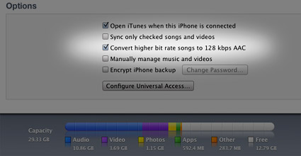 iTunes for a while has had an option where when syncing to an iPod shuffle it will automatically convert songs to a low bitrate to fit more songs on. I realized a couple of weeks ago that this option now exists for iPods and iPhones too - it appears on the main iPhone screen when you look at the device in iTunes
