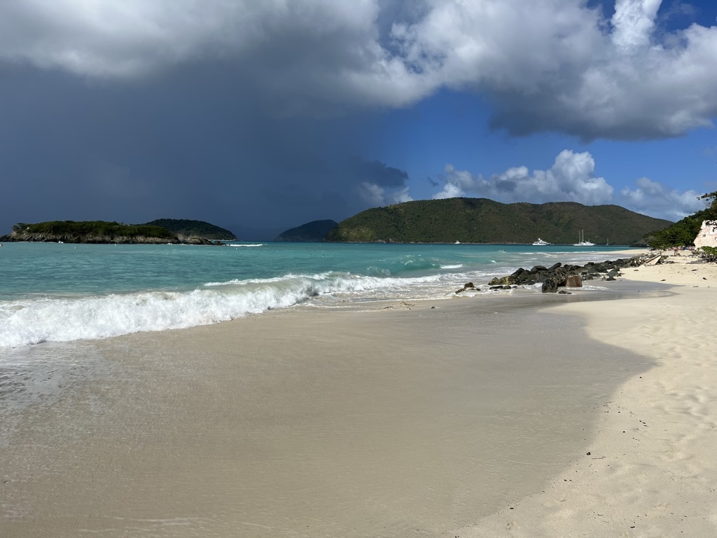 February in St John usually has excellent weather. About 80 degrees fahrenheit / 27 celsius, occasional showers that usually stop after 10 mins (but give great rainbows while they last), and some wind to take the heat off. And that weather usually leads to calm seas on the north shore beaches. But for the first time since we’ve been going there there was a marine warning on the morning of day 6, with high waves.