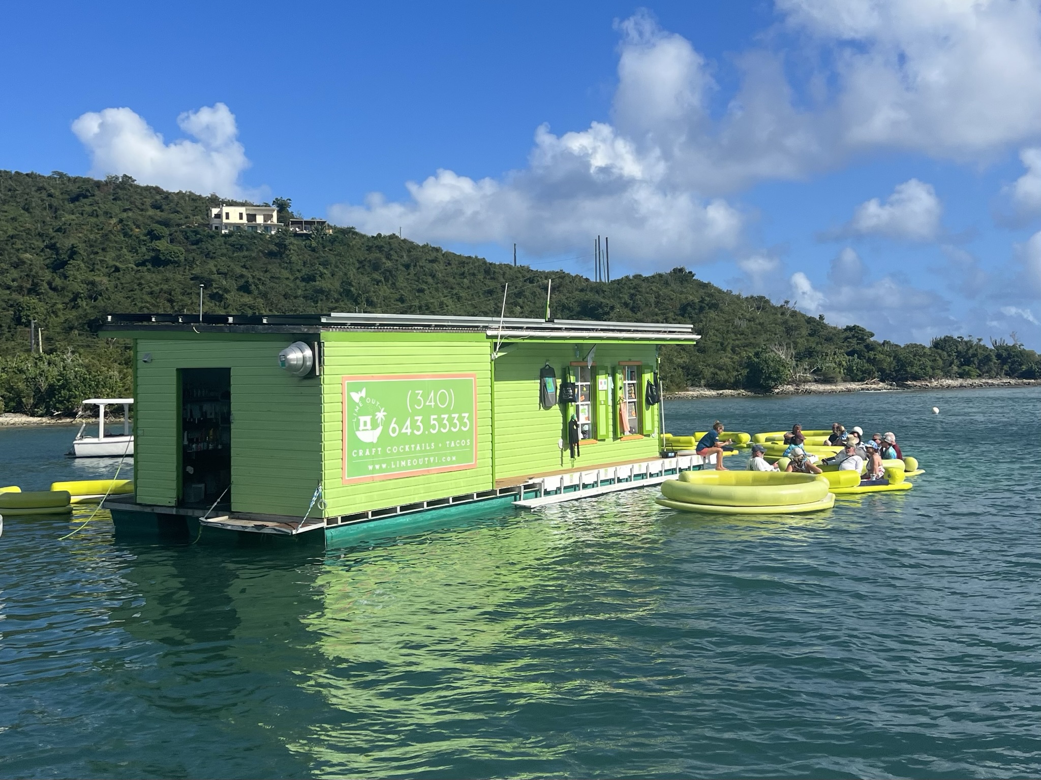 The bar itself is a barge, basically. You don’t go inside, but it has seats in the water around the edge or (much more fun) has floating “lily pad rings” where 6 people can sit facing each other while sitting in the sea. You then shout your order to the bar staff on the barge, and they then push your drinks / etc. across the water on a float. Genius. The cocktails were great, the experience was absurdly fun, the tacos were surprisingly good, and I thoroughly recommend it.